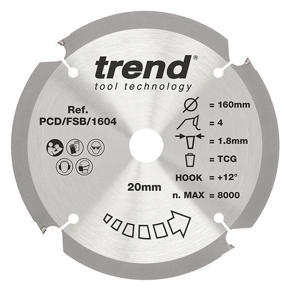 Trend Cement Fibre Board Saw Blade 160mm Diameter x 4 Teeth x 20mm Bore x 1.8mm Kerf is a range of polycrystalline diamond blades for cutting a wide variety of ultra-hard and abrasive materials. For use in circular, plunge, table, and mitre saws, Trend PCD Fibre Cement blades are exceptionally durable and retain their cutting edge for longer than TCT alternatives. Ideal for AQUAPANEL, HardieBacker, gypsum, composite decking & cladding, laminate flooring, fibre & glass reinforced polymer, and compact laminate worktops.