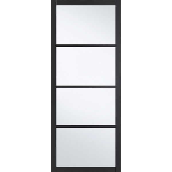 The Ailesbury Black 4 Panel Clear Glass 44mm Door is crafted with a beautiful and smooth black finish, adding a touch of elegance to your home. Designed for stability and durability, each door is coated with a special matt finish that enhances its lifespan, ensuring long-term quality and performance. Available in 6'8" x 2'10", 6'8" x 2'8", 6'6" x 2'9", 6'6" x 2'6", 6'6" x 2'4".