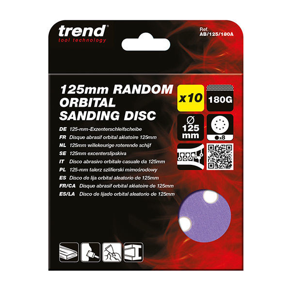 Trend 125mm 180 Grit Random Orbital Sanding Discs (10 Pack) is a high-performance, multi-material abrasive suitable for wood, paint, plastic, filler, plaster, and metal. Available in 40, 60, 80, 120, 150, 180, and 240G, ideal for paint removal, flattening, shaping, feathering, keying, denibbing & deburring.