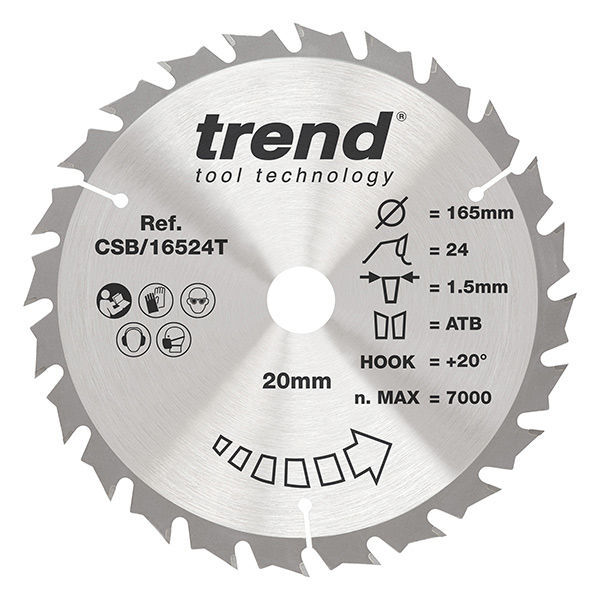 Trend Craft Thin Kerf Saw Blade 165mm Diameter x 24 Teeth x 20mm Bore x 1.5mm Kerf is a range of thin kerf tungsten carbide tipped blades for wood and wood-based materials. For use in cordless circular, plunge, and table saws, and available in a range of finishes. Ideal for ripping and trimming softwood, hardwood, plywood, MDF, and hardboard.